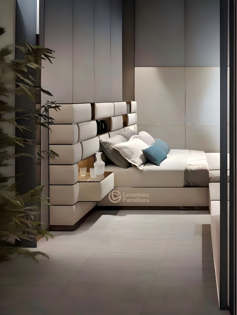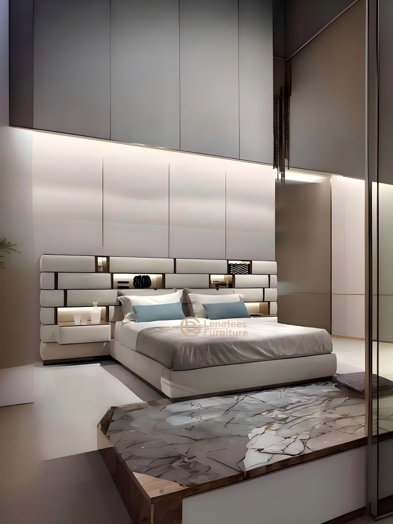 इस लक्जरी बिस्तर में परिष्कृत धातु के लहजे के साथ एक बोल्ड हेडबोर्ड है - जिसमें आराम, शिल्प कौशल और समकालीन डिजाइन का मिश्रण है।